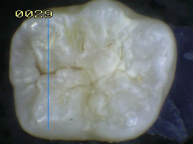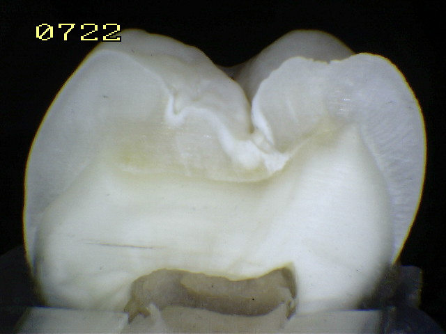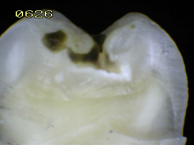 Observe como el corte en la fosa presenta caries en dentina,