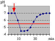 Esta curva es llamada Curva de Stephan por su "inventor". (218) Hay un aumento de la concentración del ion hidrógeno en la placa bacteriana; con la concecuente aparición del proceso de desmineralización del esmalte dental. Muestra que después de unos minutos de ingerir la comida rica en hidratos de carbono fermentables, el pH baja a un nivel crítico (Linea roja) es decir a un nivel donde el esmalte comienza a desmineralizarse (Alrrededor de 5,5 pH)