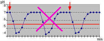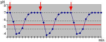 Después de cada bocado, el pH cae a un nivel dónde comienza el proceso de desmineralización. Los bocados repetidos mantienen el pH por debajo del nivel crítico.  (Línea horizontal roja)