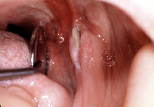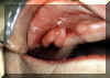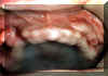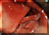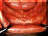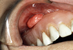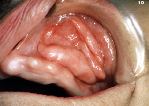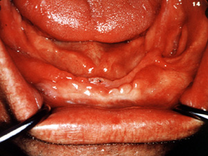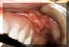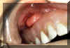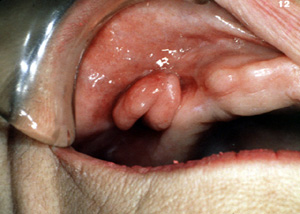 Aquí son dos épulis, bilaterales, en los vestíbulos del maxilar. Es una apariencia típica. Son lobulados  y muestran áreas focales aumentadas de vascularidad. En la porción central de cada masa hay una ranura ó una invaginación  que corre en una dirección anterior-posterior. La pestaña de la dentadura postiza encajará en estas ranuras.