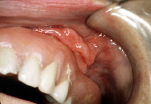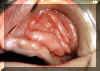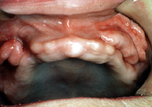 Aquí la dentadura postiza está en el lugar y usted notará como el borde o pestaña de la dentadura se introduce en la invaginaciones. Esto indicaría que hay espacio considerable entre la pestaña y  reborde alveolar. La irritación constante por el borde de la dentadura postiza que choca con en el tejido mucoso da lugar a la producción continua de tejido conjuntivo fibroso inflamado.