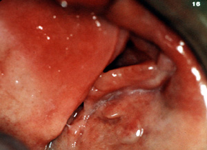 Esta vista más aumentada de la lesión del lado izquierdo  está compuesta de por lo menos tres pliegues de tejido bastante denso. Hay invaginaciones profundas entre los pliegues.