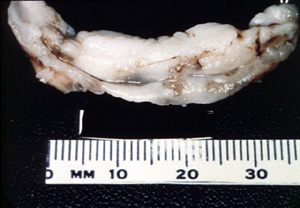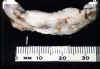 Esta microfotografía de baja resolución  ilustra bien el aspecto lobulado de la lesión. Hay una invaginación profunda en la porción central en que la pestaña de la dentadura postiza fue localizada.