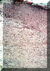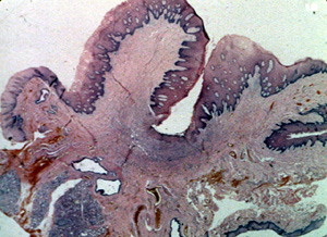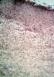 Este microfotografía se observa el área ulcerada en la base de la invaginación y muestra exudado inflamatorio, tejido fibroso reactivo  y tejido de granulación.