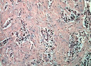 Periférico a la ulceración el tejido del tipo predominante que comprende la mayoría de la lesión, es el tejido conjuntivo fibroso bastante denso con un número moderado de los vasos sanguíneos. Note la inflamación crónica perivascular  tan común en las lesiones reactivas. Los fibroblastos son uniformes a lo largo  hay  considerable colágeno denso. Con esta microfotografía usted puede determinar que la única forma de eliminar la lesión es con la biopsia por escisión.