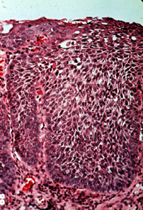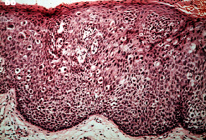 En algunos casos las anormalidades celulares son tan severas y la maduración del epitelio muy pobre, que el espesor entero del epitelio no hay diferencia entre la capa basal y la superficie. Cuando ocurre esto la lesión se designa carcinoma in situ. Todavía no hay infiltración en el tejido conjuntivo.