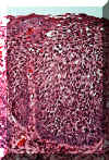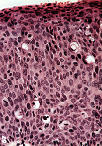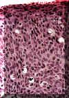 Con una resolución más alta de la imagen 66, puede ser algo difícil determinar qué lado es la basal y cual es la superficie. Las anormalidades celulares son obvias y la maduración es casi inexistente.