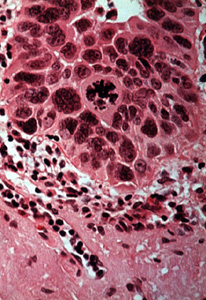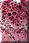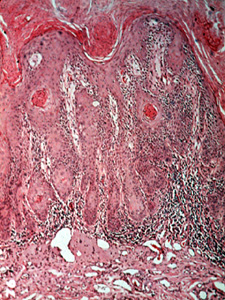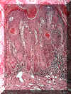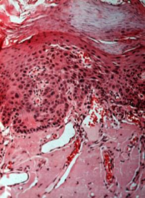Una vista a más aumentos muestra  las anormalidades celulares similares a aquéllas descriptas en el displasia de la mucosa, dilatación vascular y degeneración del colágeno extensa ("elastosis senil"). Éstas son las alteraciones debido a la radiación solar.