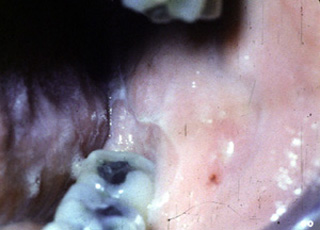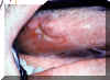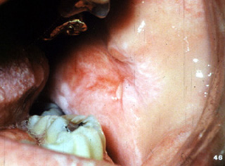 bucal. En la periferia de la ulceración hay estrías blancas similares