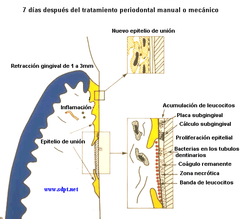 3. Después de aproximadamente 7 días la mayoría del tejido conjuntivo se cubre con epitelio y una nuevo epitelio de unión se ha formado contra la superficie del diente. En las áreas descubiertas los leucocitos constituyen la barrera hacia el ambiente del espacio subgingival. Los estudios han mostrado que es prácticamente imposible  limpiar el área subgingival de todas las especies de  bacterias y de  todo el cálculo. El proceso inflamatorio y las proliferaciones bacterianas continúan por consiguiente pero en un nivel que es difícil de observar clínicamente. Sin embargo estos procesos se desarrollan igual  con una limpieza cuidadosa  de la región. Clínicamente uno debe evitar procedimientos que podrían interferir con el proceso de curación natural.  Por ello hay que evitar el sondaje periodontal para evaluar la profundidad de bolsa. También a veces se  requiere de un  ajuste de la anatomía de la raíz , por ejemplo en las lesiones de furcación de molares, durante el tratamiento periodontal. Para luego facilitar la higiene dental diaria de esa zona.