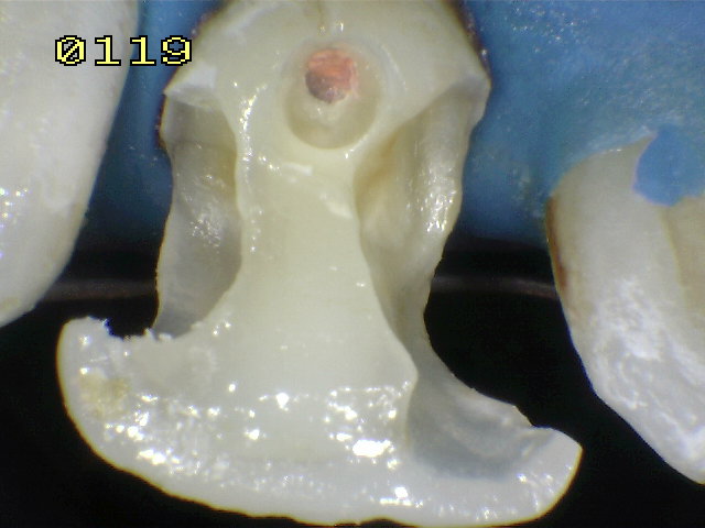 Esmalte grabado con acido ortofosfórico al 37 % durante 30 segundos, con base de compuesto calcico fraguable.
