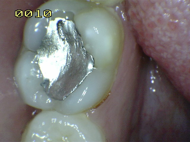 Amalgama de 5 años , observe el desbordamiento por el típico flow de la amalgama en el borde cavo superficial.