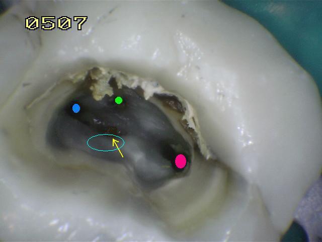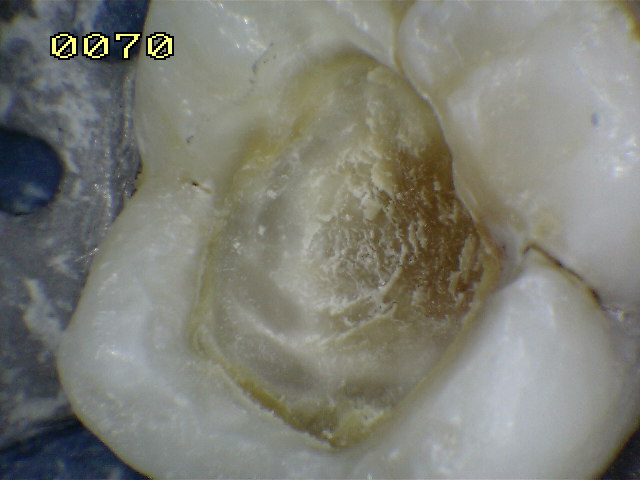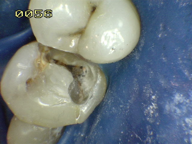 Observe la dentina desorganizada que cambia de color, esta debe ser eliminada
