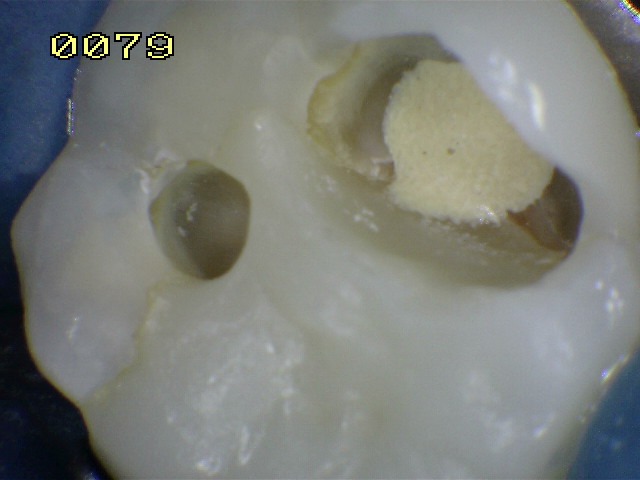 Observe la recidiva de caries debajo de la resina compuesta remanente en pieza dental endodonciada