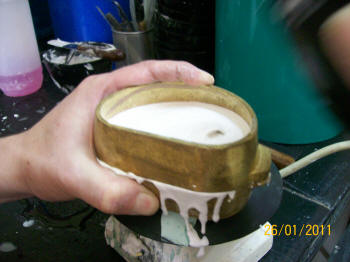 Se coloca la contramufla y se vacía con yeso taller. Se utiliza una vibradora de banco para evitar atrapar burbujas en el yeso.