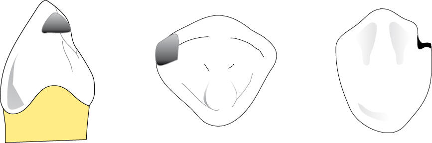 Distintas ubicaciones del apoyo oclusal en canino, cuando esta pieza dental suele ser la única para recibir carga: