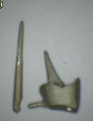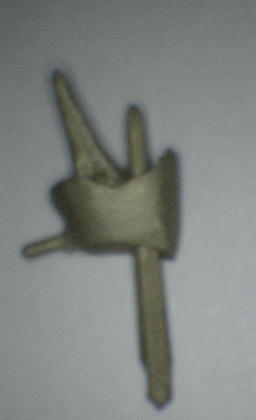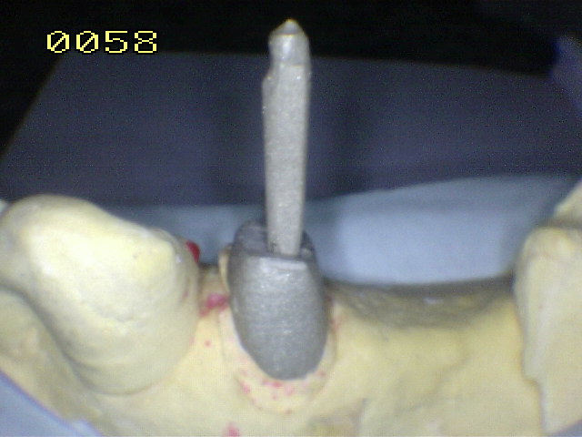 Un perno muñón colado para un primer premolar  superior, que consta de dos raíces y por lo tanto debemos tallar dos conductos, que en su mayoría presenta una gran divergencia hacia vestibular y palatino. La solución dada por el técnico dental consiste en una base colada con un perno muñón, de preferencia en la raíz palatina;  y una espiga pasante en la raíz vestibular. Ver imagen inferior