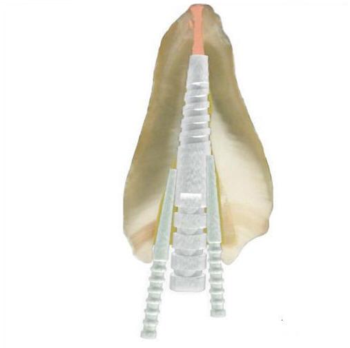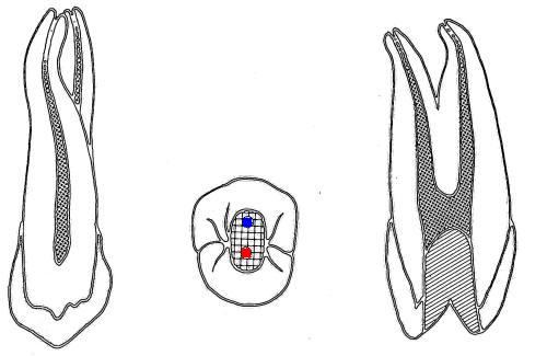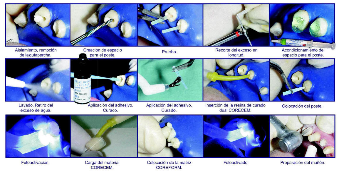 Molares superiores e inferiores: Pernos de polímero en la mayor raíz y un segundo perno de polímero en la raíz de mayor volumen subsiguiente. Molares superiores e inferiores: Perno muñón colado en la raíz de mayor volumen y espiga pasante en la raíz de mayor volumen subsiguiente.