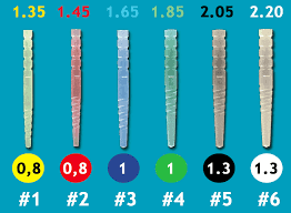 Distintos diámetros de pernos en milimetros.  Los mas utilizados en la clínica son el Nº 1 y el Nº 2,  para obtener la máxima profundidad de anclaje.
