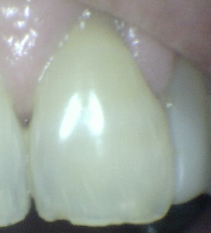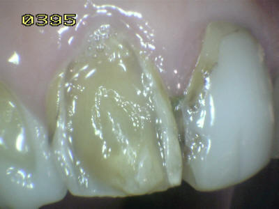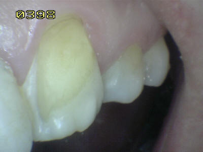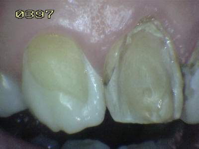 Observe como se ha perdido la estructura dental en 13, 12 y  en 11 una carilla en resina compuesta  donde se ha deteriorado el borde cavo superficial de la misma. En 23 el mismo patrón de desmineralización dental