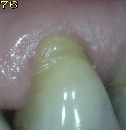 Retracción de encías por excesiva fuerza durante el cepillo. En pieza dental 24 se observa defecto cuneiforme de esmalte y dentina.