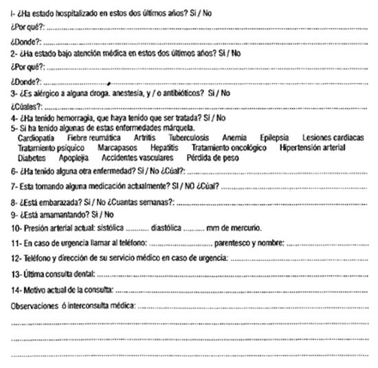 El encabezado de la ficha dental para el paciente ambulatorio debe tener todos estos datos para identificar a nuestro paciente; de lo contrario no tiene valor legal como documento. El segundo paso a seguir es evaluar el estado de salud general de nuestro paciente.
