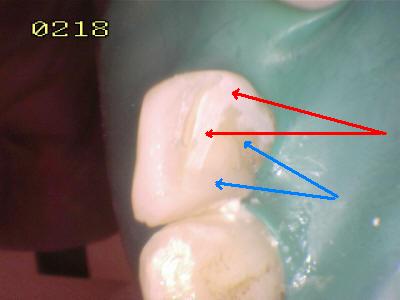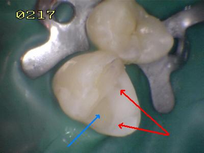 • Verificar el patrón de grabado del esmalte, suele tener el aspecto clínico de color tiza o falta de brillo (Flechas rojas: grabado del esmalte y La flecha azul: marca la resina compuesta de un material de obturación)