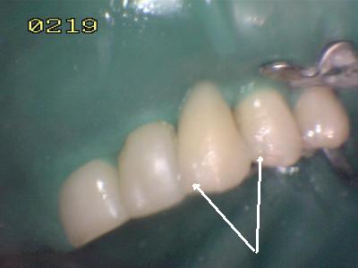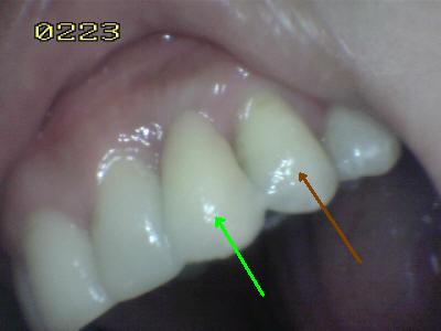 • Observar el aspecto estético, y eliminar los posibles excesos de cemento. (La flecha verde indica cual es el póntico tipo Maryland; la flecha marrón indica el diente natural al cual se ha imitado la tonalidad o matiz)