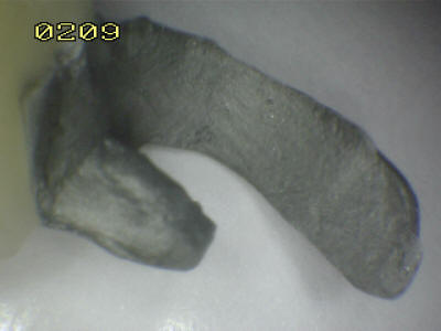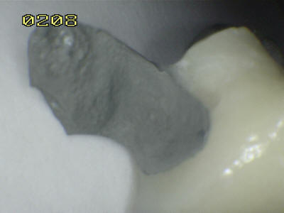 • Grabado realizado por arenamiento con partículas de óxido de aluminio  de 50 micrones: Observe el aumento de la rugosidad, esto hace que se duplique o triplique la superficie de contacto metálica. En la fotografia se muestra la escala de 0.2 mm