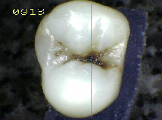 El diente visto en estado  húmedo pueden tener una clara opacidad de caries (lesión de mancha blanca) y / o decoloración marrón de caries que es más ancha que la fisura natural y la fosa, que no es consistente con la apariencia clínica de esmalte sano.  Una vez seco, se observa  una pérdida de estructura dental cariada en la entrada, o dentro de la fosa o fisura . Esto se ve visualmente como evidencia de desmineralización en la entrada o dentro de la fisura o fosa, y aunque la fosa o fisura puede aparecer sustancialmente  más ancha que lo natural, la dentina no es visible en las paredes o la base de la cavidad ó discontinuidad.