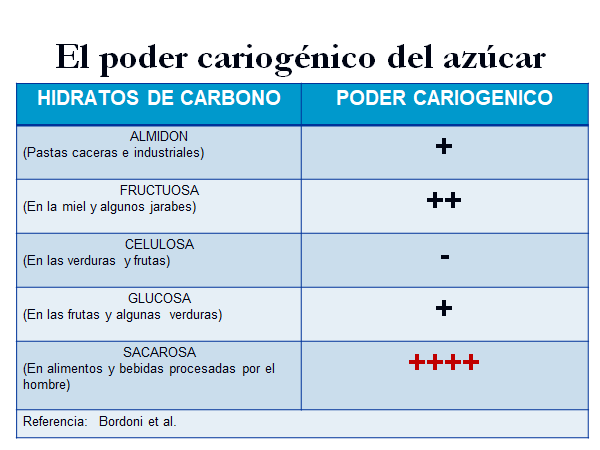 El azúcar de mesa es un disacárido, fermentable por las bacterias de la cavidad oral. Su consumo en frecuencia mayor a 4 bocados entre comidas, produce el aumento de una bacteria a que se encuentra en las superficies de los dientes. Esta bacteria conocida por los odontólogos como estreptococos mutans, es la causa de caries de superficies lisas.