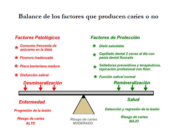 Un hueco pequeño ilustra alto riesgo. Un ligero cambio producirá caries. Por ejemplo, una disminución en la secreción de saliva, un aumento en el consumo de azúcar ó una higiene oral deficiente cerrará el hueco.
